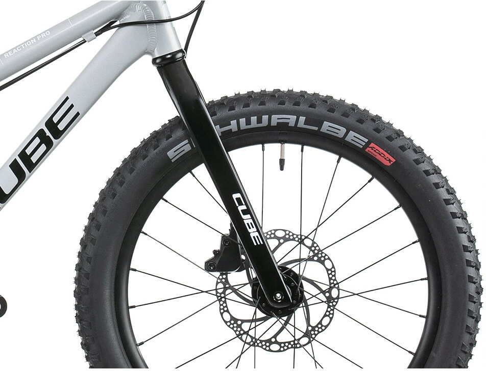 Reaction 200 Pro er fremstillet af den samme slags varmebehandlede 6061-aluminiumrør, som du finder på de gode voksencykler. Cube bruger også den samme mekaniske rørformningsproces til at justere rørformerne for at opnå den bedste kombination af styrke og vægt. Der er en fuld carbongaffel med gennemgående aksel for at spare endnu mere vægt. Skivebremsemontagene og kabelføringen giver mulighed for større sikkerhed og bremseevne med skiver. Og et udskifteligt derailleurophæng sikrer dig mod dyre reparationer i tilfælde af mindre uheld. Gribende Schwalbe-dæk, lette og robuste Newmen-fælge og kraftige skivebremser. Og styret, sadlen, krankstiverne og grebene er alle perfekt proportioneret til en voksende rytters hænder, så de vil være komfortable og have fuld kontrol. Lad os få det sjovt.