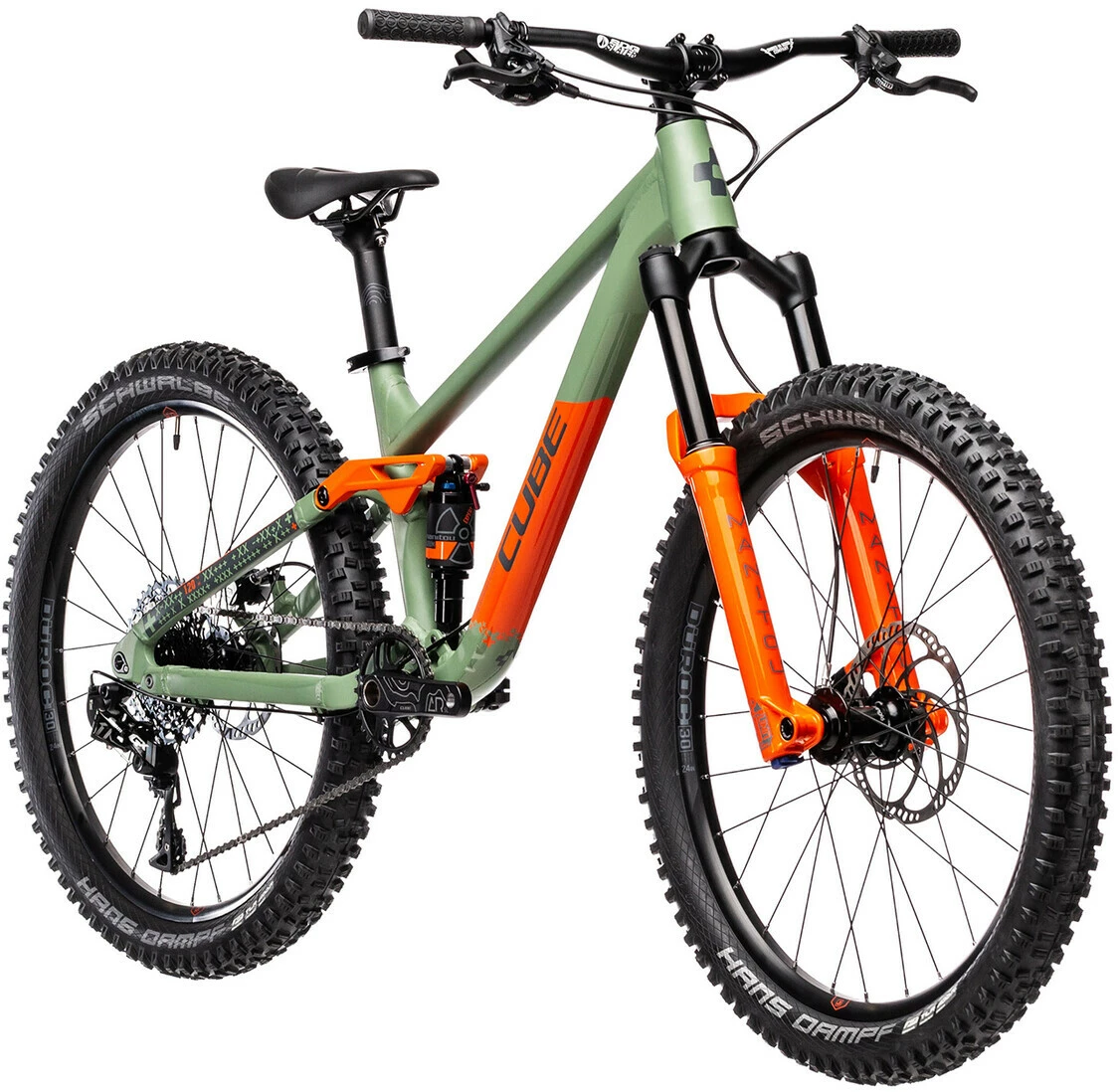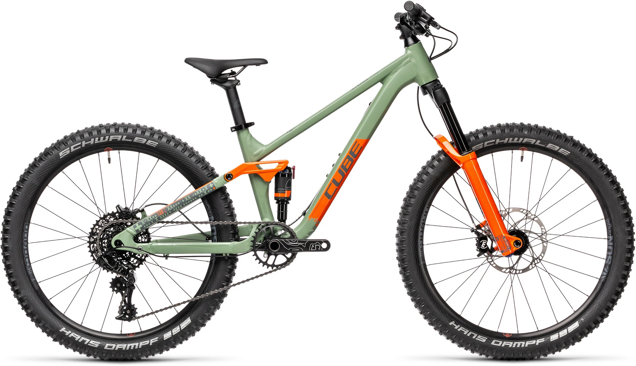 Loads of experience goes into every CUBE frame – and the Stereo 240 Pro is no exception. The wheels may be smaller than the other full-suspension bikes, but the attention to detail is just as thorough. CUBE uses the same kind of butted aluminium tubes as the full-size bikes, and apply the same suspenion kinematics. There’s a replaceable gear hanger so that the inevitable crashes don’t result in an expensive frame repair, and it’s all passed the strict in-house safety tests with flying colours – so you know it’s not just a fun ride, but a safe one too.