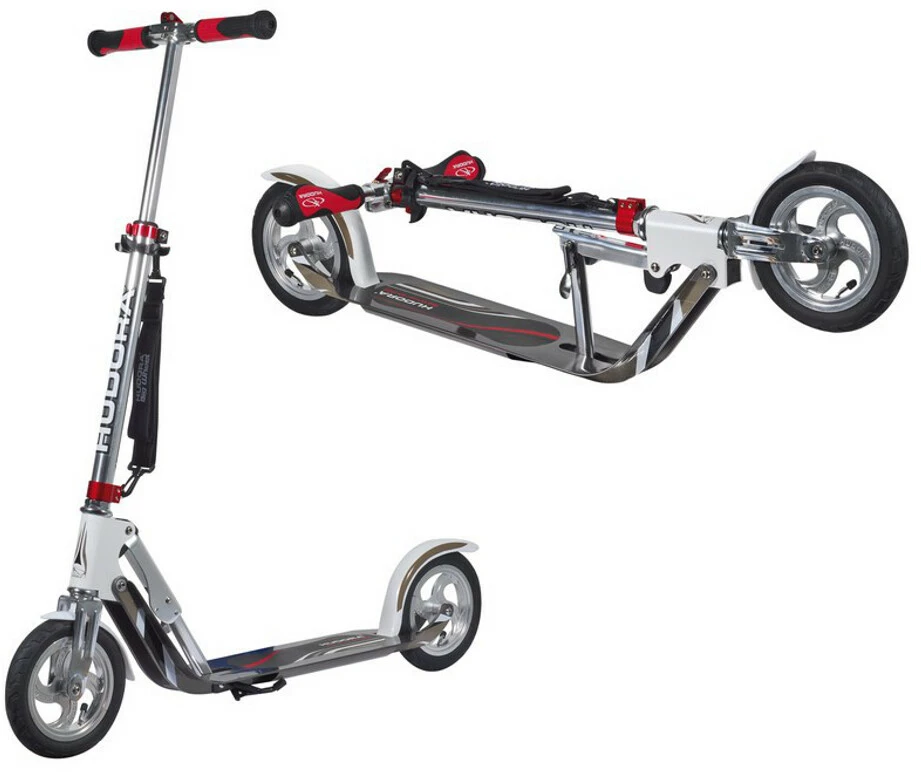 HUDORA Big Wheel Air 230-scooteren er med sine to store luftdæk velegnet til næsten ethvert terræn. Luftdæk er også stødabsorberende og behagelige at køre på. HUDORA Big Wheels kombinerer sportlighed med kørekomfort. HUDORA Big Wheel Air er sammenklappelig og let, smidig og komfortabel. De store, stødabsorberende luftdæk er monteret på lette aluminiumsfælge. En smudsfanger bagpå og foran holder tøjet rent – så denne scooter er også velegnet til den daglige pendling. HUDORA Big Wheel Air har et aluminiumdæk af høj kvalitet med forstærkede vinger og et sammenklappeligt, højdejusterbart styr. Anti-Shock-komfortgrebet minimerer vibrationer og maksimerer komforten for rytteren. Udstyret på denne aluminiumsscooter med klokke, reflekser og stativ opfylder de højeste krav. Med sin komfort, sikkerhedsfunktioner og førsteklasses udstyr er denne scooter med luftdæk en sporty følgesvend til hverdagsbrug.