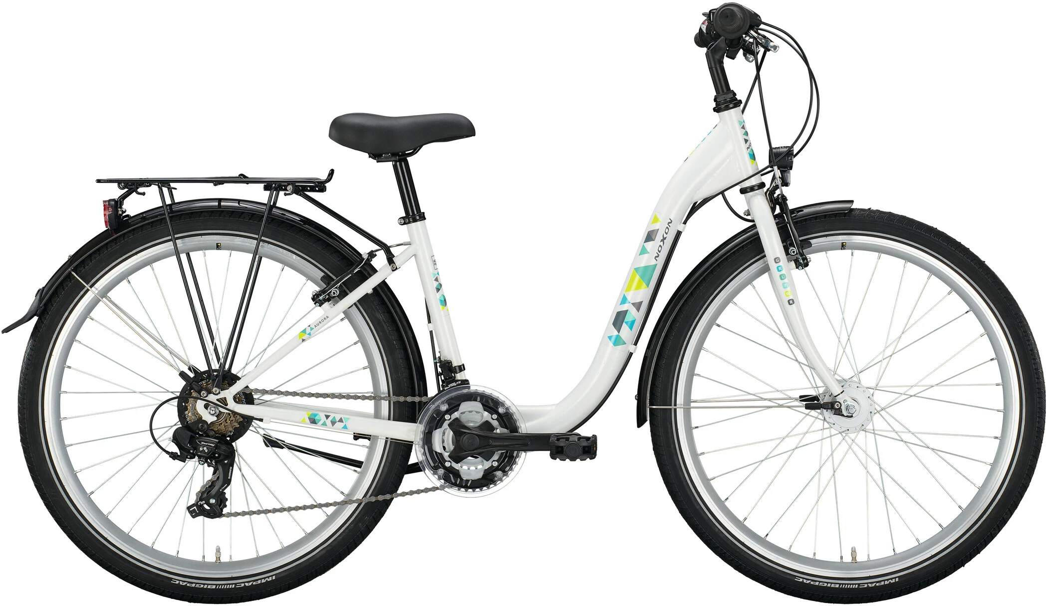 Small but mighty! The Noxon Kids Bike not only looks cool, but also has a sturdy frame with the kids on every ride beaming with joy, no longer want to get off. Whether they are on the way to school, on a family trip or are just driving around with friends. The Noxon Kids Bike survives everything. Equipped with 26″ tires and 3 gears, make effortless climbing of climbs possible.