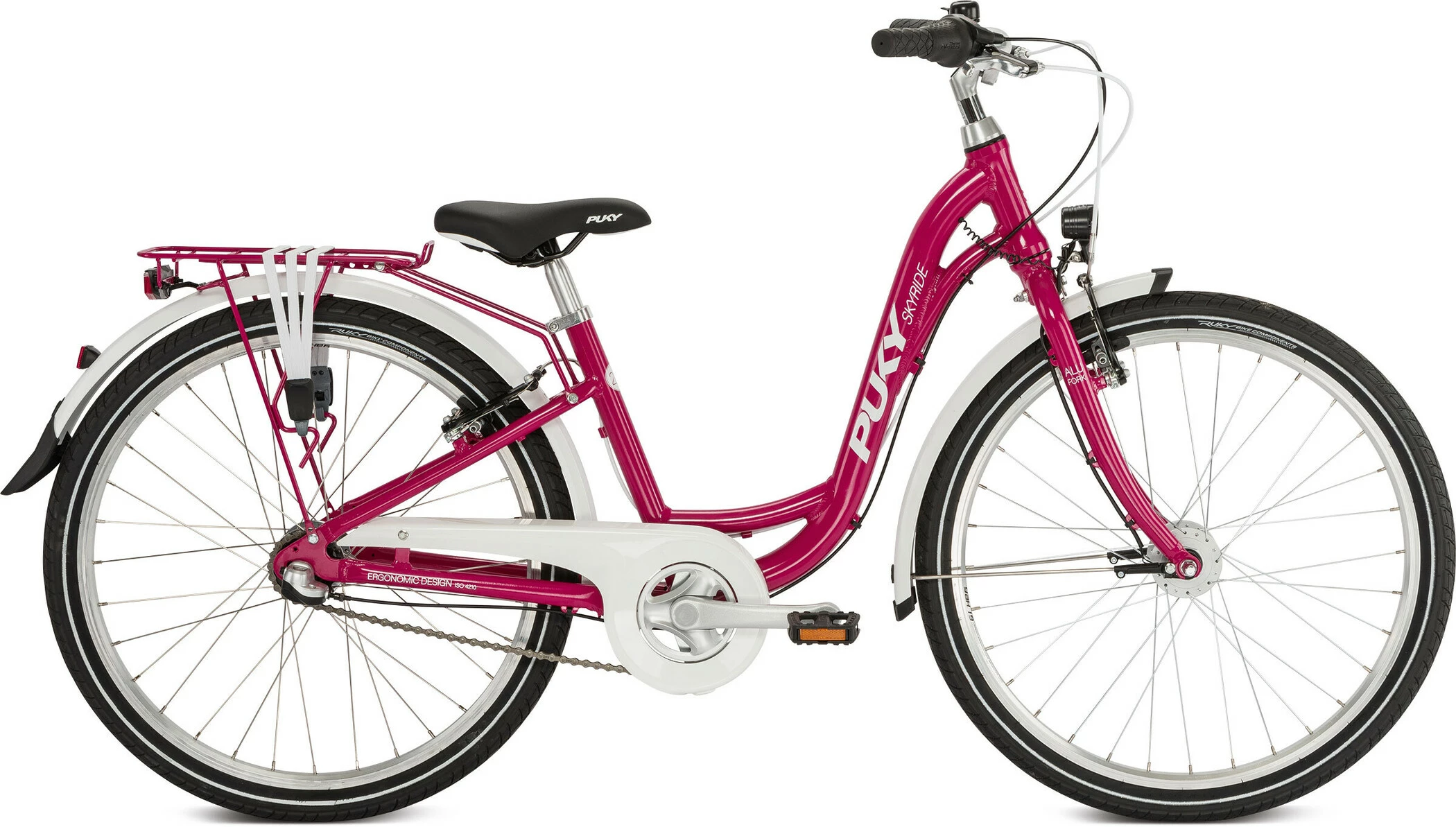 With a completely new frame design, our popular SKYRIDE series enters the new season. The PUKY designers have selected all components with care and focus on the use of lightweight components and an optimized frame geometry. Thus, the frame of the SKYRIDE 24-3 is made of aluminum, has aluminum hollow section rims and of course a shock-resistant powder coating. This allows us to guarantee a long service life across generations. But also the eye-catching appearance knows how to convince. Besides the neutral Berry color, the PUKY SKYRIDE series is also available in the cool vintage colors retro-green and retro-blue. In the latter two, the bell, handlebar grips, saddle and luggage rack are optimally matched to the retro look. This is sure to attract the attention of kids over 12. As a bike with full StVZO equipment, the SKYRIDE 24-3 has a high-quality lighting system with LED headlights (on/off automatic) which is powered by the Shimano hub dynamo. Reflective stripes on the tires and various reflectors ensure the best visibility in the dark. For the way to school or small bike tours, we have equipped the SKYRIDE 24-3 with a Shimano 3-speed hub gears with freewheel and two V-brakes. The freewheel ensures a perfect starting position at traffic lights or crossings and the brakes bring the bike safely to a stop. A bike like we would have liked in our youth. The SKYRIDE 24-3!